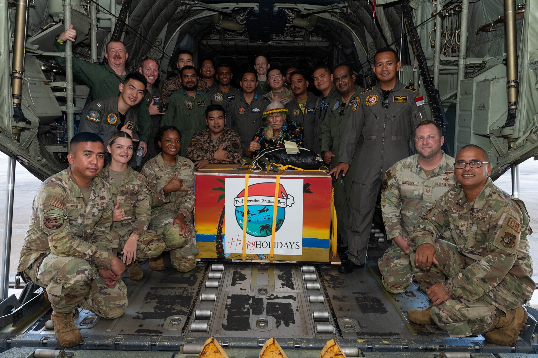 International guests and Operation Christmas Drop participants pose for a photo while attending the Operation Christmas Drop push ceremony at Andersen Air Force Base, Guam, Dec. 9, 2024. The tradition began during the Christmas season in 1952 when a B-29 Superfortress aircrew saw islanders waving at them from the island of Kapingamarangi, 3,500 miles southwest of Hawaii. In the spirit of Christmas, the aircrew dropped a bundle of supplies attached to a parachute to the islanders below, giving the operation its name. Today, airdrop operations include 58 islands throughout the Pacific. (U.S. Air Force photo by Senior Airman Jarrett Smith)