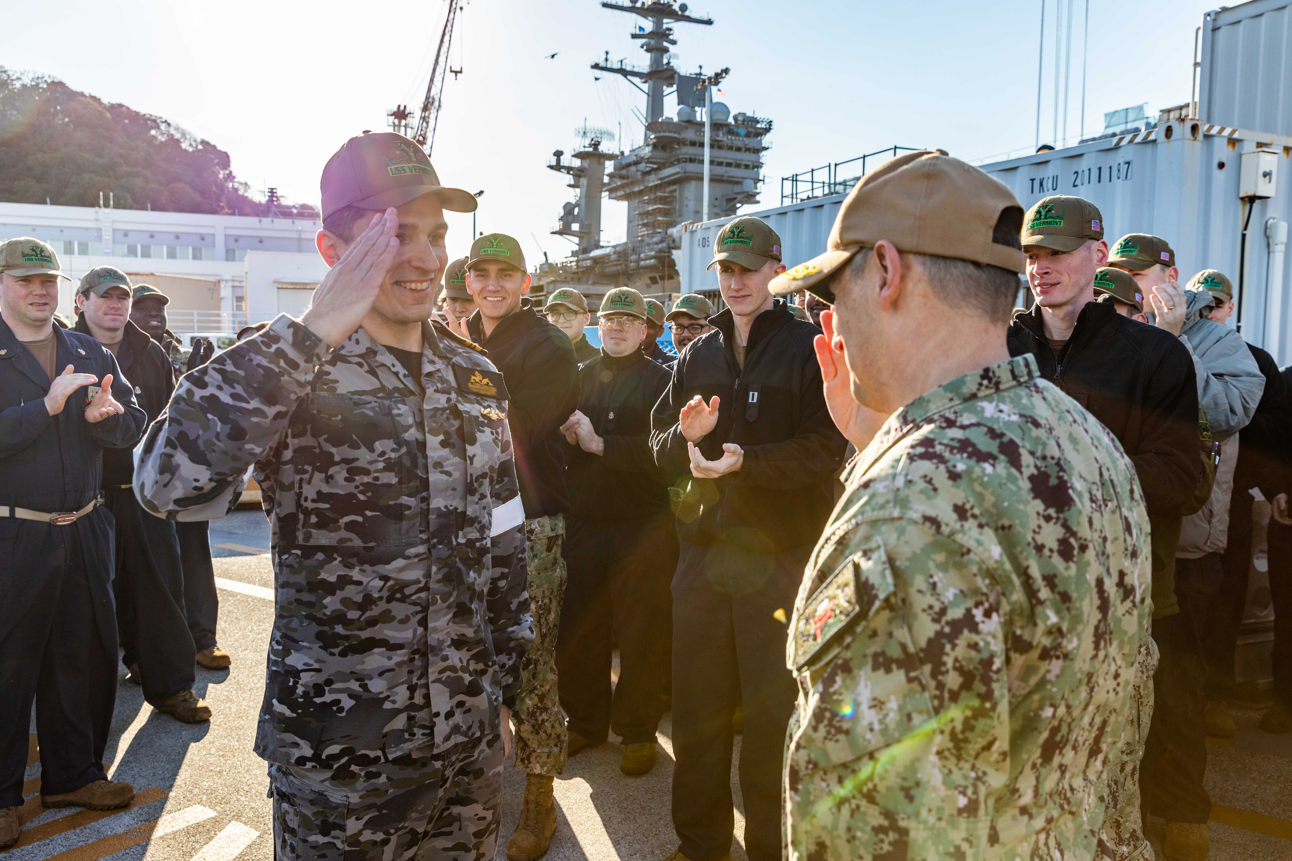 YOKOSUKA, Japan (Dec. 12, 2024) – Rear Adm. Chris Cavanaugh, commander, Submarine Group 7, salutes Royal Australian Navy Lt. Cmdr. James after pinning a U.S. Navy Submarine Warfare Device during pier-side quarters for the Virginia-class fast-attack submarine USS Vermont (SSN 792) at Commander, Fleet Activities Yokosuka, Dec. 12. Vermont is on deployment supporting the U.S. 7th Fleet, the U.S. Navy’s largest forward-deployed numbered fleet, operating with allies and partners in preserving a free and open Indo-Pacific region (U.S. Navy photo by Mass Communication Specialist 2nd Class Daniel G. Providakes) (This photo has been altered and last name per Royal Australian Navy protocols)