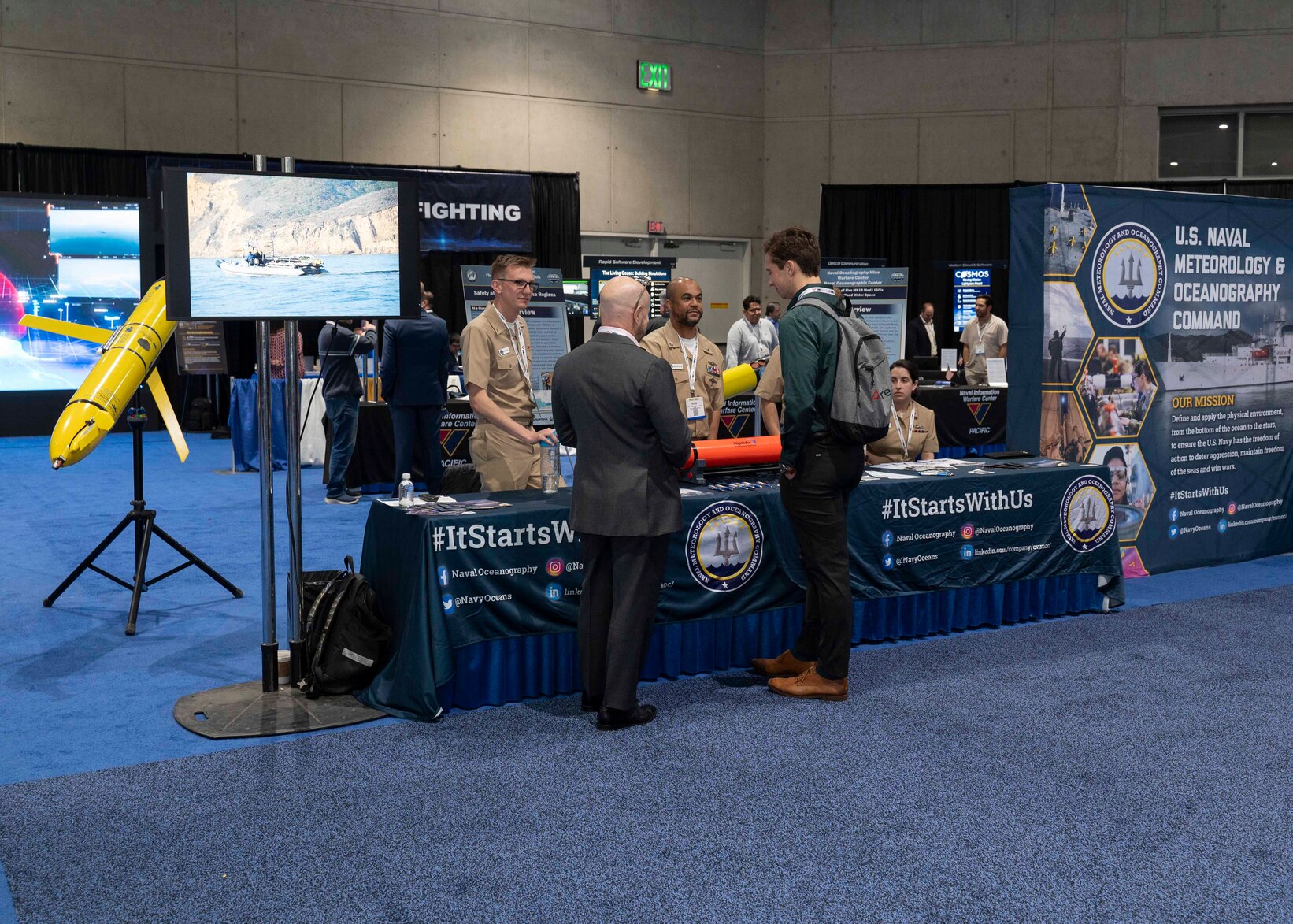 Naval Meteorology and Oceanography Command representatives explain their mission and capabilities to industry partners during WEST Conference 2025. WEST connects military, industry, and academia experts together to find innovative solutions to enhance operational capabilities that overcome complex challenges and evolving threats. (U.S. Navy photo by Ramon Go)
