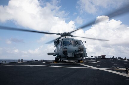 SOUTH CHINA SEA (Feb. 6, 2025) A Royal Australian Navy MH-60R Seahawk helicopter lands on the flight deck of the Arleigh Burke-class guided missile destroyer USS Benfold (DDG 65) during multilateral operations with Australia and the United Kingdom in the South China Sea, Feb. 6. Benfold is forward deployed and assigned to Destroyer Squadron (DESRON) 15, the Navy’s Largest DESRON and U.S. 7th Fleet’s principal surface force. (U.S. Navy Photo by Mass Communication Specialist 2nd Class Monica Walker.)