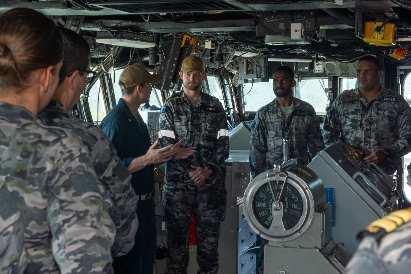 CAIRNS, Australia (April 16, 2025) – Lt. Cmdr. Hunter Van Hook leads Royal Australian Navy Indigenous Development Program cadets on a tour of the U.S. 7th Fleet flagship USS Blue Ridge (LCC 19) during a scheduled port visit in Cairns, Australia, April 16, 2025. The Blue Ridge and embarked U.S. 7th Fleet staff conduct regular Indo-Pacific patrols to deter aggression, strengthen alliances and partnerships, and advance future warfighting capabilities. (U.S. Navy photo by Mass Communication Specialist Seaman Damian Cook)