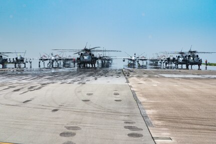 U.S. Air Force and U.S. Navy assets line up on the runway for an elephant walk during a routine operational readiness exercise at Kadena Air Base, Japan, May 6, 2025. Kadena Air Base is committed to a free-and-open Indo-Pacific. (U.S. Air Force photo by Senior Airman Tylir Meyer)