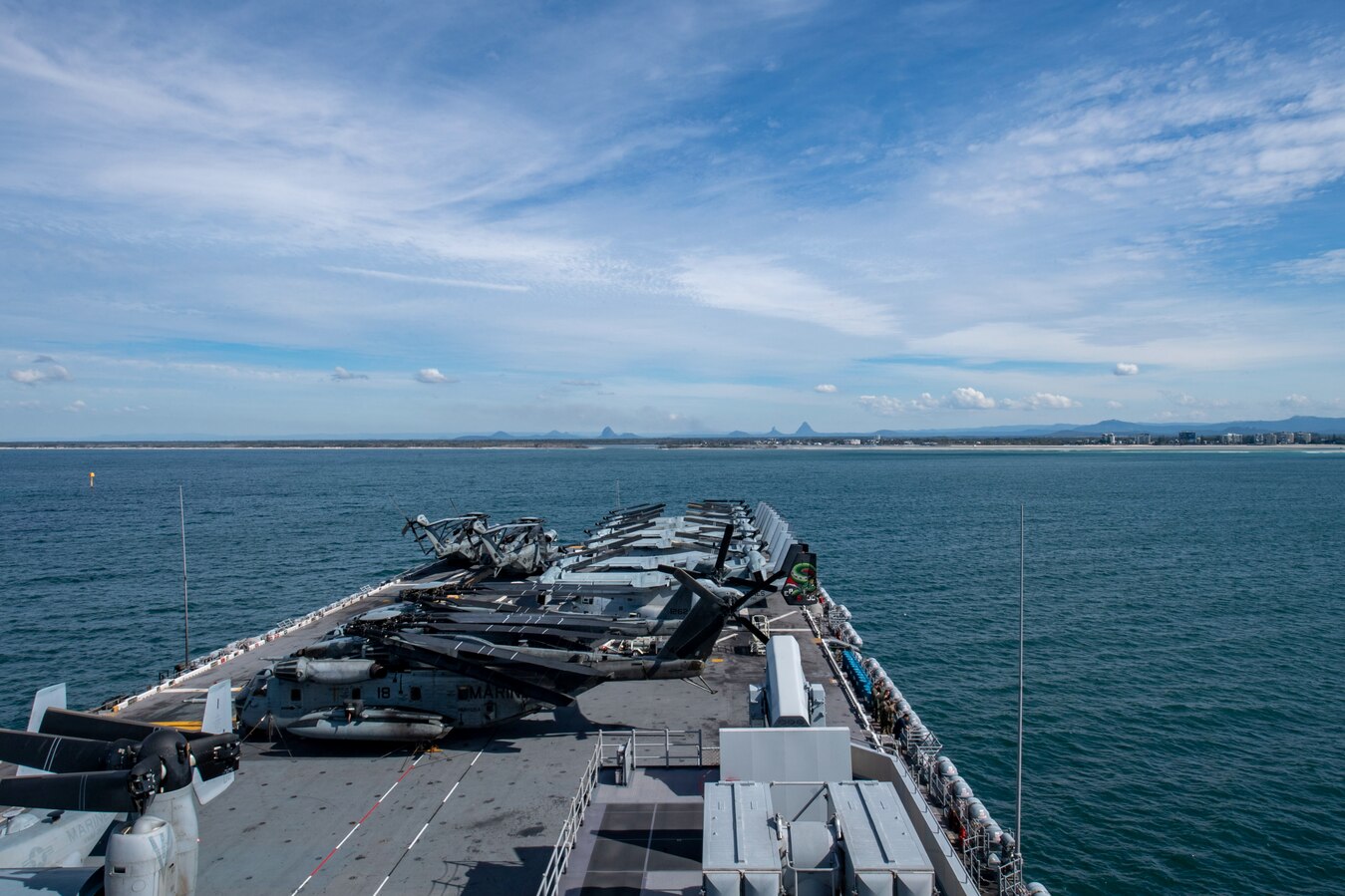BRISBANE, Australia (July 9, 2025) The forward-deployed amphibious assault ship USS America (LHA 6) pulls into Brisbane, Australia, for a scheduled port visit July 9. The America, lead ship of the America Amphibious Ready Group, is operating in the U.S. 7th Fleet area of operations. U.S. 7th Fleet is the U.S. Navy’s largest forward-deployed numbered fleet, and routinely interacts and operates with allies and partners in preserving a free and open Indo-Pacific region. (U.S. Navy photo by Mass Communication Specialist Seaman Nicholas Douglass)