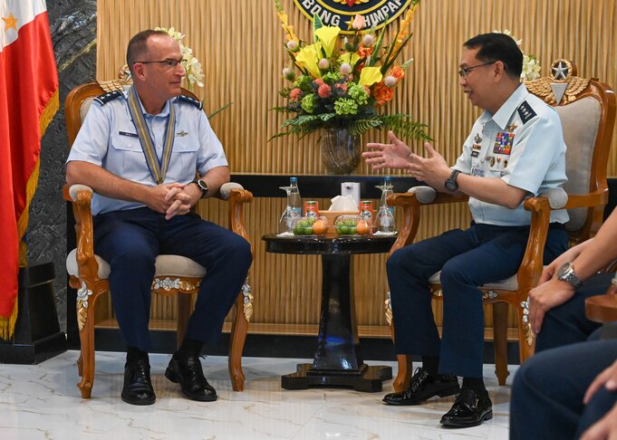 Lt. Gen. John Healy, Chief of the Air Force Reserve and commander of Air Force Reserve Command, meets with Lt. Gen. Arthur Cordura, Commanding General of the Philippine Air Force, to discuss future collaboration at Manila, Philippines, August 18, 2025. Healy embarked on a multi-nation visit to the Philippines, Palau, and the Republic of Korea as part of the Reserve Allies and Partners Program (RAPP). (U.S. Air Force photo by Staff Sgt. Stuart Bright)