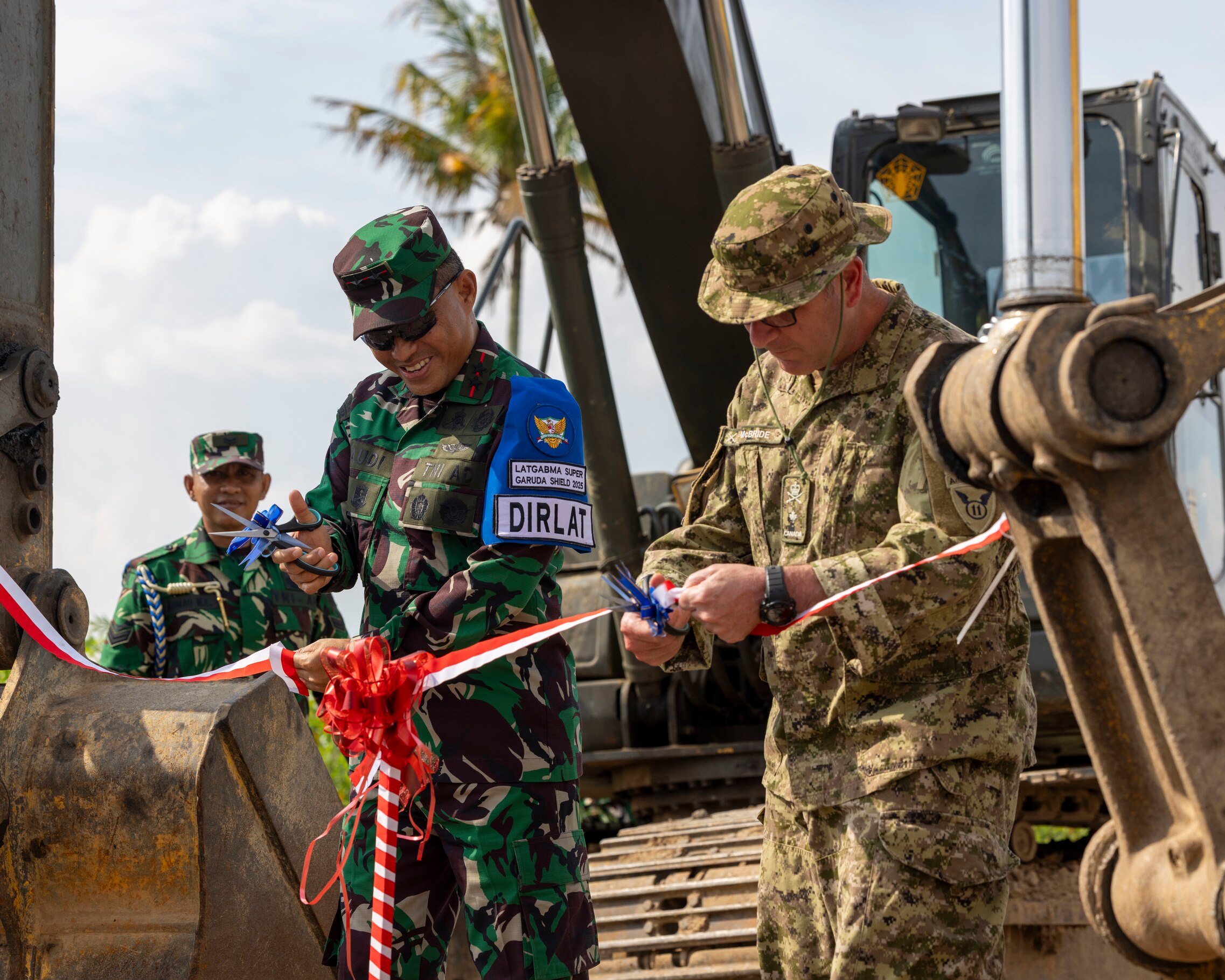 Indonesian Armed Forces Lt. Gen. Naudi Nurdika, commander of the Indonesian Army Education and Training Command, left, and Canadian Brig. Gen. Robert McBride, deputy commanding general, operations, 11th Airborne Division, right, cut ribbons opening a newly constructed road during exercise Super Garuda Shield 25 in Baturaja, Indonesia, Sept. 2, 2025. Super Garuda Shield is an annual exercise between the Indonesian National Armed Forces and U.S. Military designed to strengthen bilateral interoperability, capabilities, and cooperation. (U.S. Army photo by Sgt. Nickson Schenk)