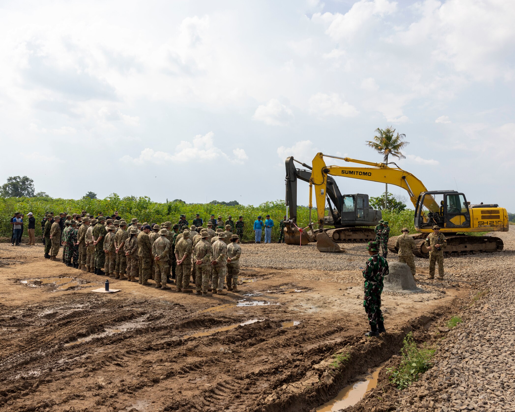 U.S. Army engineers assigned to the 523rd Engineer Support Company, 84th Engineer Battalion, 130th Engineer Brigade, engineers from the Canadian Armed Forces, and engineers from the Indonesian National Armed Forces, attend a ribbon cutting ceremony for a new road constructed during exercise Super Garuda Shield 25 in Baturaja, Indonesia, Sept. 2, 2025. Super Garuda Shield is an annual exercise between the Indonesian National Armed Forces and U.S. Military designed to strengthen bilateral interoperability, capabilities, and cooperation. (U.S. Army photo by Sgt. Nickson Schenk)