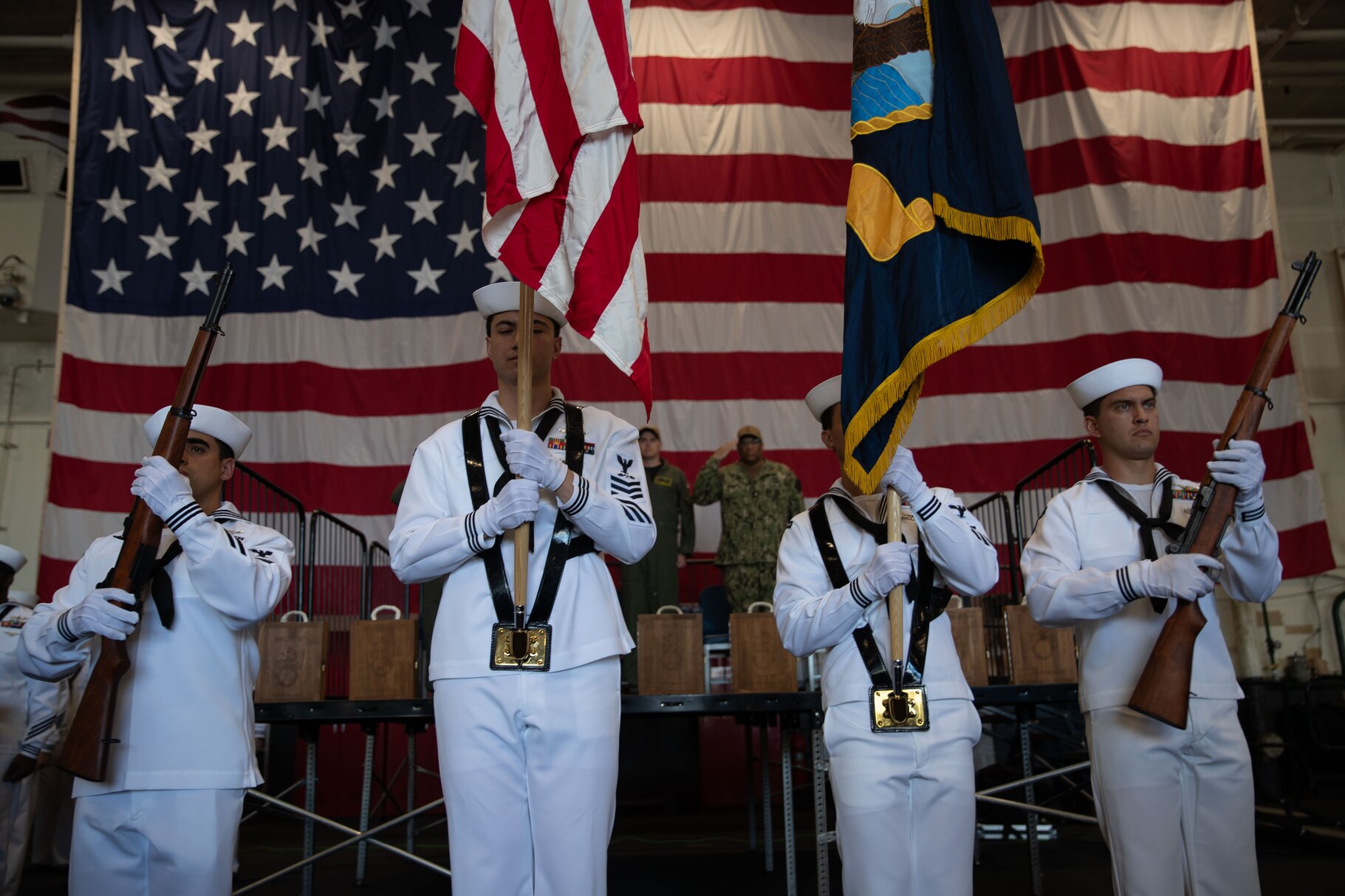 Sailors perform color guard duties during a Sept. 11 memorial service aboard Nimitz-class aircraft carrier USS George Washington (CVN 73) while moored pierside at Commander, Fleet Activities Yokosuka, Sept. 11, 2025. George Washington is the U.S. Navy’s premier forward-deployed aircraft carrier, a long-standing symbol of the United States’ commitment to maintaining a free and open Indo-Pacific region, while operating alongside allies and partners across the U.S. Navy’s largest numbered fleet. (U.S. Navy photo by Mass Communication Specialist Seaman Apprentice Daniel Williamson)