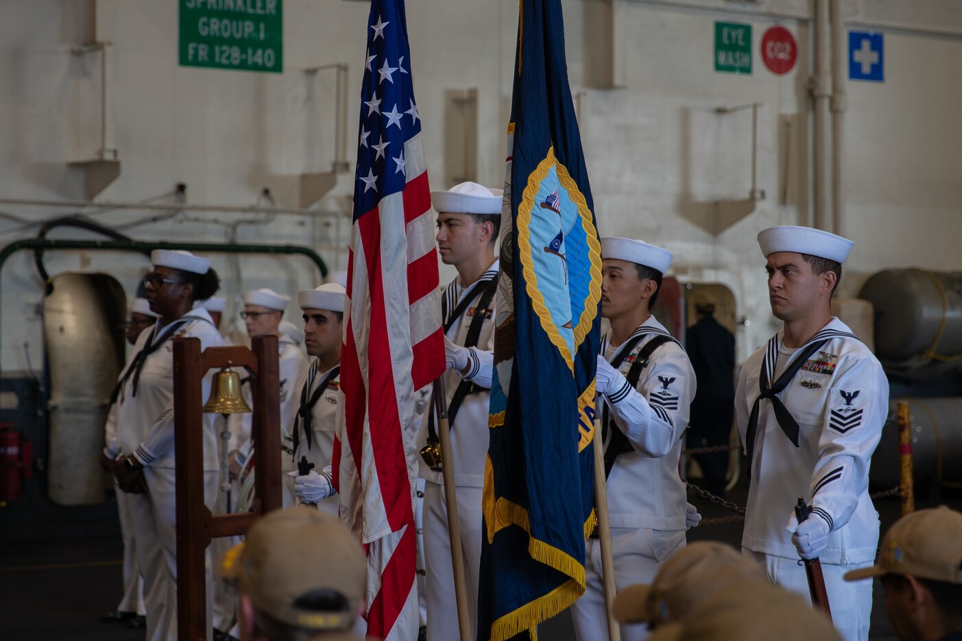 Sailors perform color guard duties during a Sept. 11 memorial service aboard Nimitz-class aircraft carrier USS George Washington (CVN 73) while moored pierside at Commander, Fleet Activities Yokosuka, Sept. 11, 2025. George Washington is the U.S. Navy’s premier forward-deployed aircraft carrier, a long-standing symbol of the United States’ commitment to maintaining a free and open Indo-Pacific region, while operating alongside allies and partners across the U.S. Navy’s largest numbered fleet. (U.S. Navy photo by Mass Communication Specialist Seaman Apprentice Daniel Williamson)