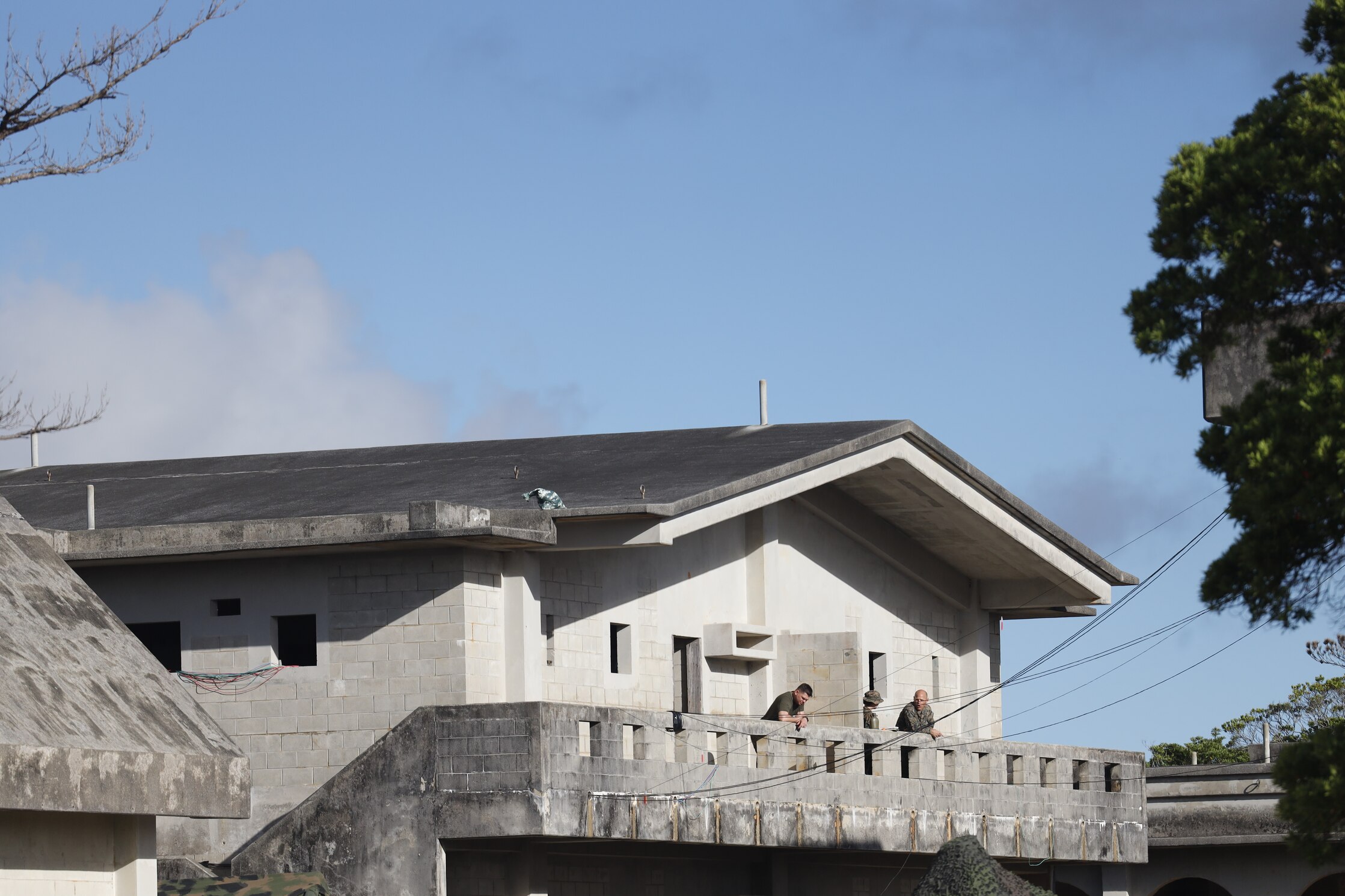 U.S. Marines and Sailors with III Marine Expeditionary Force get some air on the balconies outside their workspaces in the III MEF combat operations center in Combat Town, Camp Hansen, Okinawa Japan, Sept. 13, 2025, during the Command Post Exercise portion of Resolute Dragon 25. Resolute Dragon 25 is an annual bilateral exercise across Japan, including the southwest islands, that strengthens the command, control and multidomain maneuver capabilities of III MEF and the Japan Ground Self-Defense Force’s Western Army personnel, alongside representatives across the U.S. and Japanese Joint Force, with a focus on controlling and defending key maritime terrain. (U.S. Marine Corps photo by Gunnery Sgt. Daniel Wetzel)