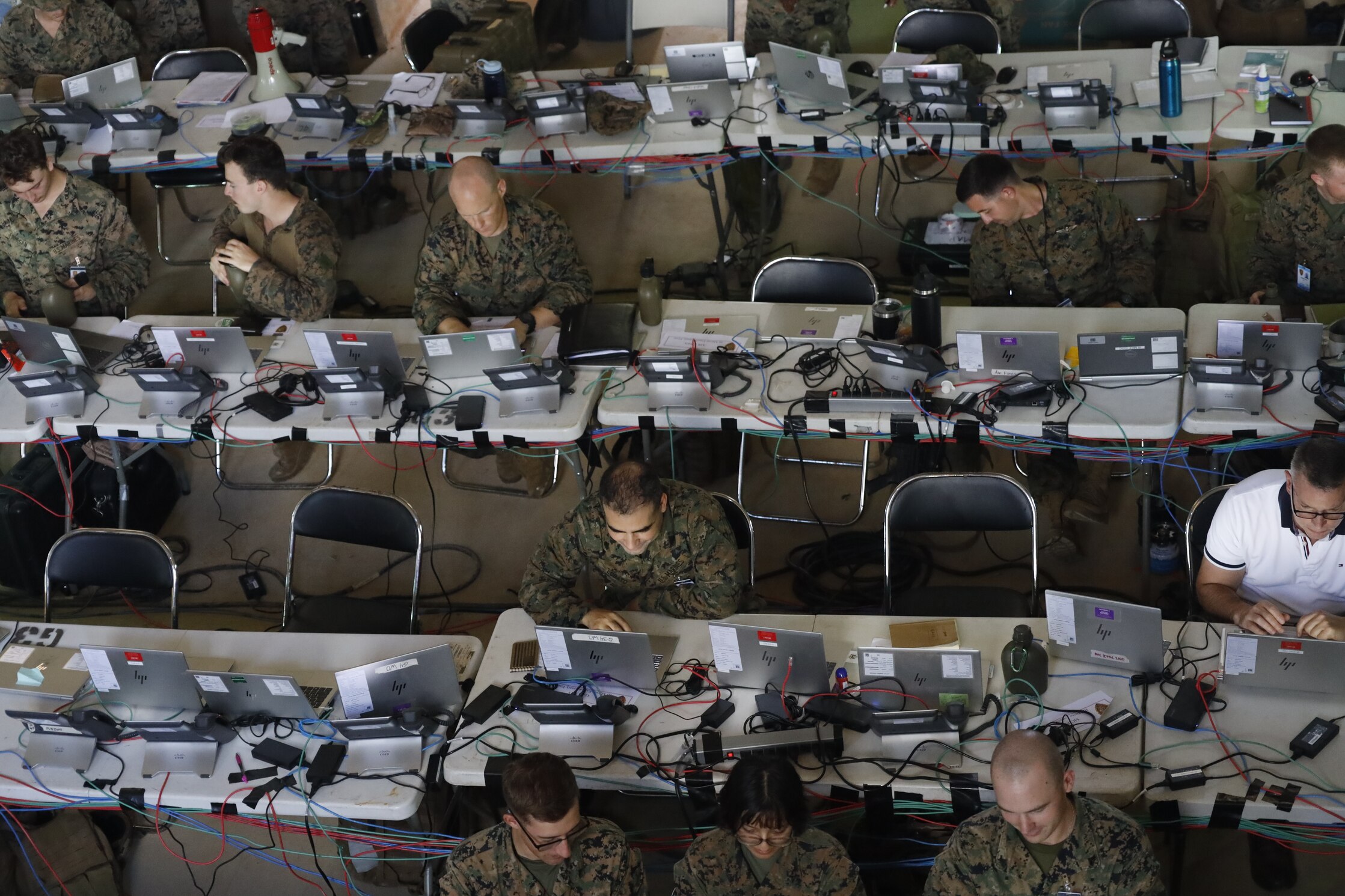U.S. Marines and Sailors with III Marine Expeditionary Force conduct simulated battle drills while working in the III MEF combat operations center in Combat Town, Camp Hansen, Okinawa Japan, Sept. 13, 2025, during the Command Post Exercise portion of Resolute Dragon 25. Resolute Dragon 25 is an annual bilateral exercise across Japan, including the southwest islands, that strengthens the command, control and multidomain maneuver capabilities of III MEF and the Japan Ground Self-Defense Force’s Western Army personnel, alongside representatives across the U.S. and Japanese Joint Force, with a focus on controlling and defending key maritime terrain. (U.S. Marine Corps photo illustration by Gunnery Sgt. Daniel Wetzel) Photo has been edited for operational security.