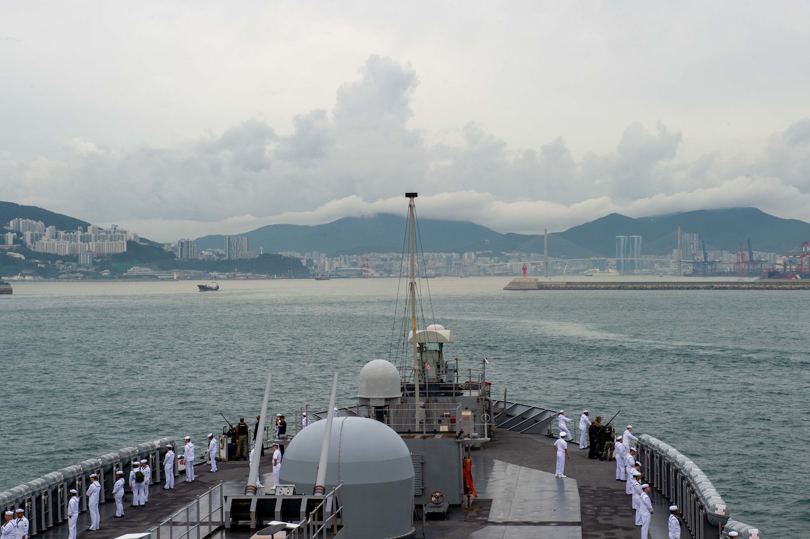 BUSAN, South Korea (Sept. 25, 2025) – U.S. 7th Fleet flagship USS Blue Ridge (LCC 19) arrives in Busan, South Korea, Sept. 25, 2025. Blue Ridge and embarked U.S. 7th Fleet staff conduct regular Indo-Pacific patrols to deter aggression, strengthen alliances and partnerships, and advance future warfighting capabilities. (U.S. Navy photo by Mass Communication Specialist Seaman Andres Fonts)