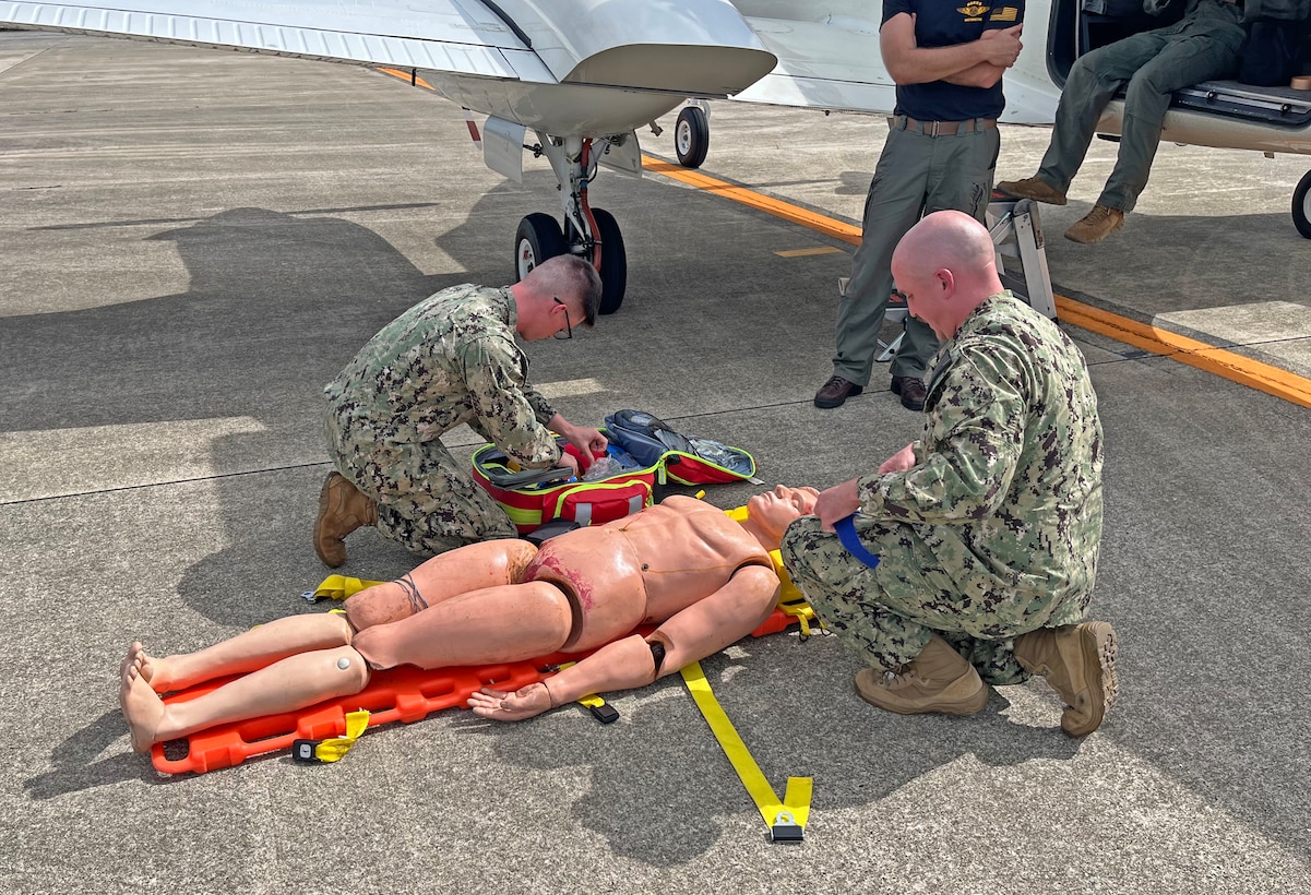 NAGASAKI, Japan (Sept. 23, 2025) – Lt. Alexander Johnson and Hospital Corpsman 3rd Class Evan Talcott, assigned to U.S. Navy Medicine Readiness and Training Command (USNMRTC) Yokosuka, transfer a simulated casualty to a C-12 Huron aircraft at Nagasaki Airport during a mass casualty drill. The patient was prepared by a U.S. Navy Medicine Readiness and Training Unit (USNMRTU) Sasebo medical crew for medical evacuation to Naval Air Facility (NAF) Atsugi. (U.S. Navy photo by Lt. Cmdr. Matthew Thomas)