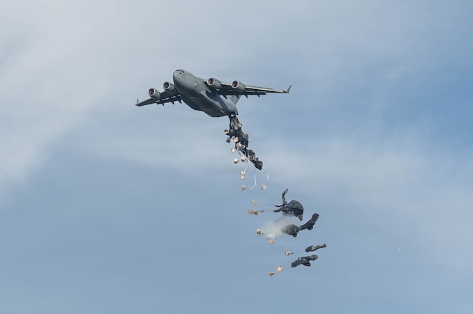 POHAKULOA TRAINING AREA, Hawaii (Nov. 7, 2025) — A U.S. Air Force C-17 Globemaster III completes a joint precision airdrop system delivery during Joint Pacific Multinational Readiness Center (JPMRC) 25-01 on Pohakuloa Training Area, Hilo, Hawaii, Nov. 7, 2025. Exercise JPMRC 26-01 is a large-scale joint and multinational exercise designed to train units and leaders in the region’s complex and austere jungle, arctic, and archipelago environments, replicating real-world conditions. JPMRC is a key way the Army contributes to Integrated Deterrence and regional security in the Indo-Pacific, training thousands of combat credible forces in the region. (U.S. Air Force photo by Staff Sgt. Alan Ricker)
