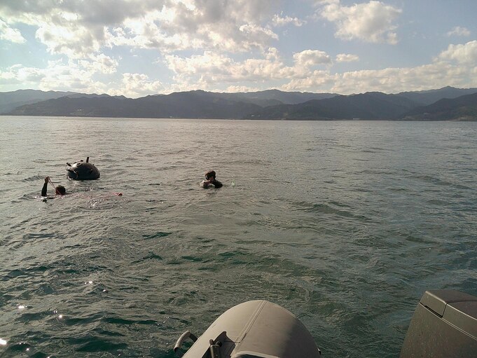 ABURATSU, Japan (Nov. 22, 2025) Explosive Ordnance Disposal Mobile Unit (EODMU) 5 Expeditionary Mine Countermeasures (ExMCM) Company 9-3 counter a simulated floating mine during Mine Warfare Exercise (MINEX) 3JA, Nov. 22, 2025. MINEX 3JA is part of a year-long series of bilateral exercise between the U.S. Navy and Japan Maritime Self-Defense Force to strengthen interoperability and increase proficiency in mine countermeasure operations. (U.S. Navy photo by Lt. Matthew Cox).
