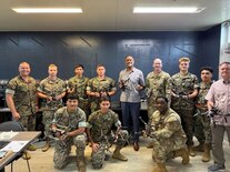 Participants in the III Marine Expeditionary Force Unmanned Systems Branch instructor course, and Pacific Multi Domain Training and Experimentation Capability Program Manager Dr. Andre Stridiron, display unmanned aircraft systems manufactured during the course at Camp Hansen, Okinawa, October 30, 2025. Participants are training to become master instructors for joint and bilateral services in support of the national strategic defense priorities of integrated deterrence through joint force readiness and multi-domain operations.