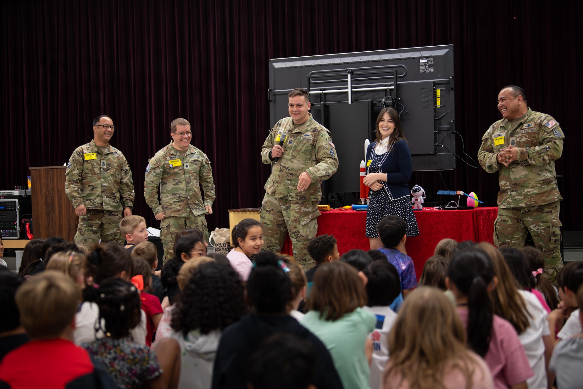 Members from the Space Systems Command STEM outreach team and U.S. Space Forces Japan answer questions from Joan K. Mendel Elementary School students at Yokota Air Base, Japan, May 16, 2024.