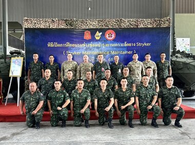 Washington Guard members and Royal Thai Army members pose for a group photo during the Stryker Maintainer and Maintenance Manager Subject Matter Expert Exchange in Chon Buri Province, Thailand, Dec. 1–19, 2025. Courtesy Photo.