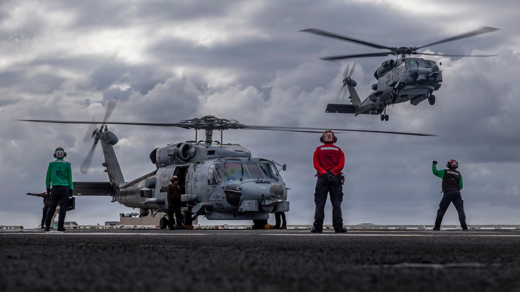 SOUTH CHINA SEA (Jan. 8, 2026) — An MH-60R Sea Hawk helicopter, attached to Helicopter Maritime Strike Squadron (HSM) 71, prepares to land on the flight deck of Nimitz-class aircraft carrier USS Abraham Lincoln (CVN 72) on Jan. 8, 2026. The Abraham Lincoln Carrier Strike Group is underway conducting routine operations in the U.S. 7th Fleet area of operations. Units assigned to 7th Fleet conduct regular Indo-Pacific patrols to deter aggression, strengthen alliances and partnerships, and advance peace through strength. (U.S. Navy photo by Mass Communication Specialist Seaman Daniel Kimmelman)