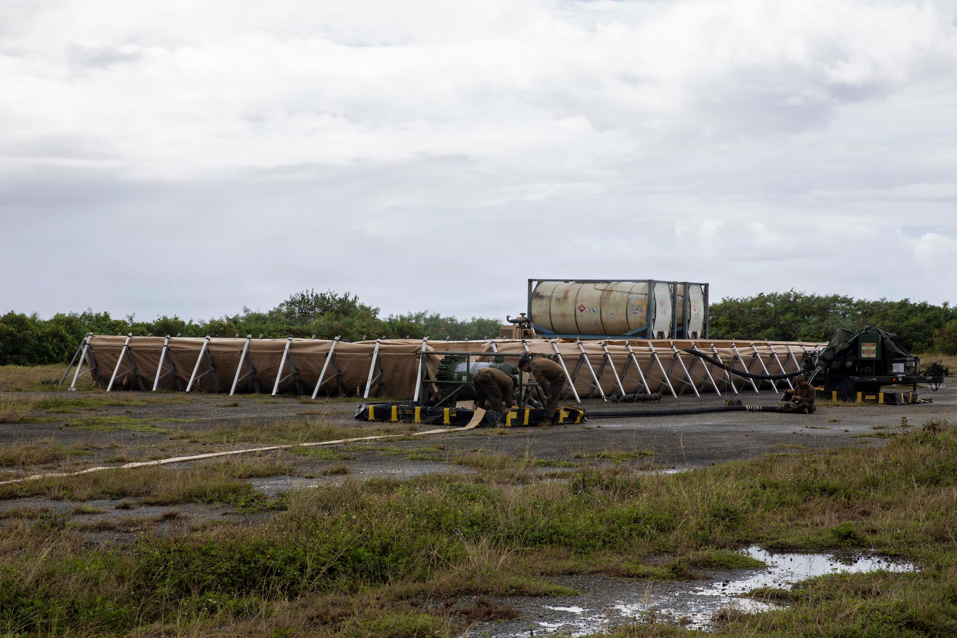 U.S. Marines with Marine Wing Support Squadron 171, Marine Aircraft Group 12, 1st Marine Aircraft Wing, set up a forward arming and refueling point during an Aviation Training Relocation program at Tinian, Northern Mariana Islands, January 16, 2026. MWSS-171 enables expeditionary aviation operations by establishing forward arming and refueling points in austere environments across the Indo-Pacific. (U.S. Marine Corps photo by Lance Cpl. David Getz)
