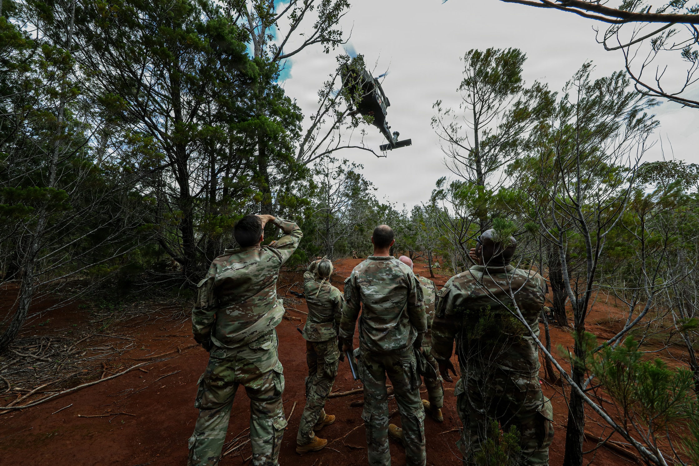 Senior U.S. Army medical leaders and Soldiers observe an air medical evacuation aircraft conduct jungle extraction operations during jungle medicine training at East Range, Wahiawa, Hawaii, Jan. 14, 2026. The demonstration highlighted the 25th Infantry Division’s ability to conduct casualty evacuation in dense jungle terrain while integrating aviation assets to support combat medical operations.