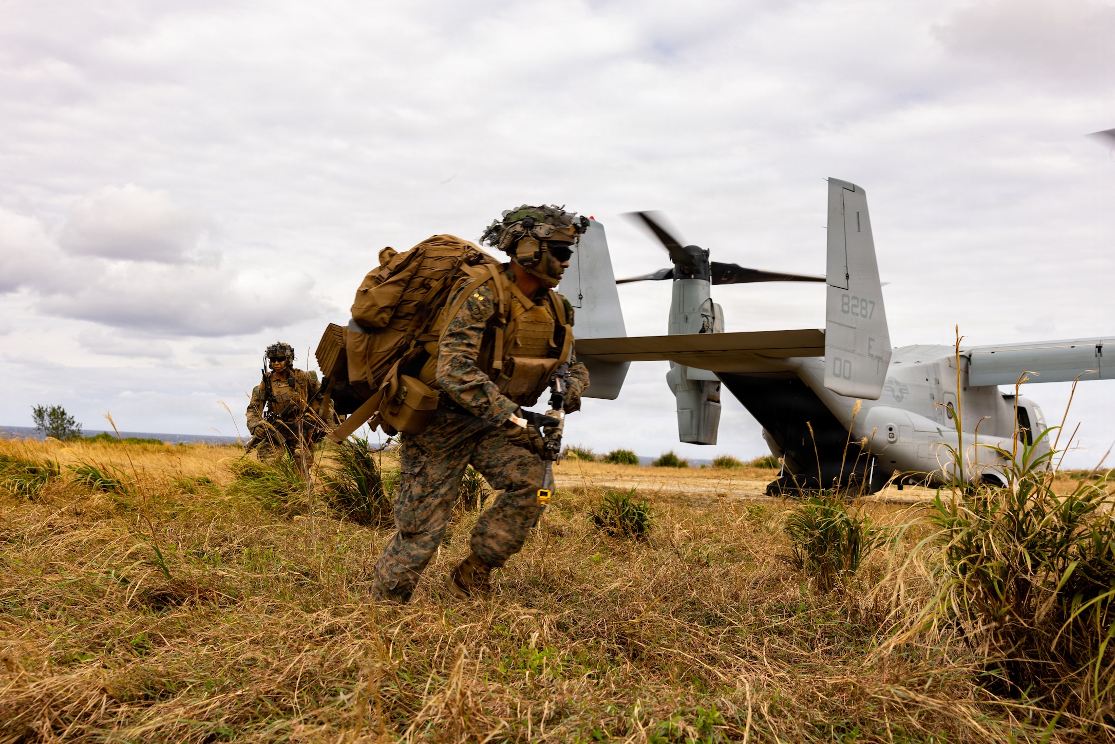 U.S. Marines with 2nd Battalion, 7th Marines, forward deployed to 3rd Marine Division, 4th Marine Regiment as part of the unit deployment program, sprint to their security positions after unloading from an MV-22 Osprey while conducting a helicopter raid as part of a combined Marine Corps Combat Readiness Evaluation on Ie-Shima, Okinawa, Japan, Jan. 27, 2026. The MCCRE is a formal evaluation of 4th Marine Regiment, 3d Reconnaissance Battalion, and 3rd Marine Division's Headquarters Battalion to confirm combat readiness for each unit. (U.S. Marine Corps Photo by Cpl. John Simpson)